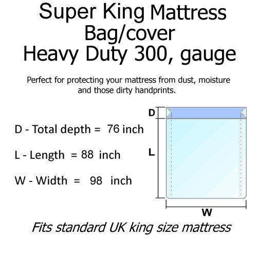 -. Brand : GroundMaster -. Feature : Strong, durable and clear plastic cover manufactured from 300 gauge polythene / The same covers as supplied to moving companies! / Designed for DIY and professional house removals. / Protects matress from dirt, dust and water. / Fits ALL mattress types upto super king beds -. Label : GroundMaster -. Manufacturer : GroundMaster -. ProductGroup : Home -. ProductTypeName : HOME_BED_AND_BATH -. Publisher : GroundMaster -. Studio : GroundMaster -. Title : SINGLE/DOUBLE/KING/QUEEN/SUPERKING BED MATTRESS DUST PROTECTION HEAVY DUTY REMOVAL BAG