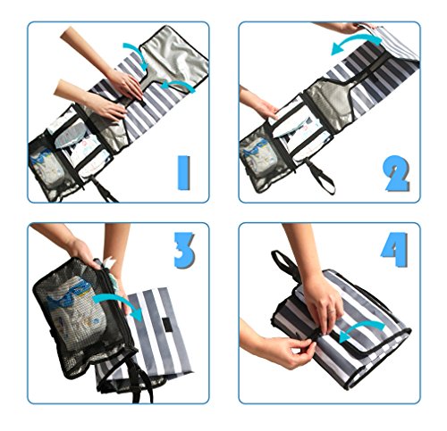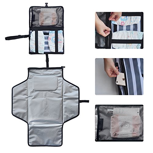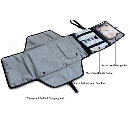 -. Feature : BEST DIAPER CHANGING PAD:Extra-long, BPA Free, Phthalate Free, Lead Free, PROTECT YOUR BABY from the nasty germs in public places / LARGE STORAGE: This portable changing pad with storage makes diapering hassle-free. The large mesh and zippered pockets are designed to have everything handy, to hold diapers, wipes, creams, baby oil or small toys / EXTREMELY PRACTICAL:This portable changing pad with pronto pillow keeps baby's head comfy,Durable 100% waterproof material,easy to wipe / EASY CARRY: The bag is Foldable, compact and travel-friendly.When it is closed,drop it in any bag, strap it to your wrist or clip it to your stroller,perfect for short car rides, airplane travel and everyday use / Two in One: The changing pad is detachable from diaper clutch, which allows you to use them separately