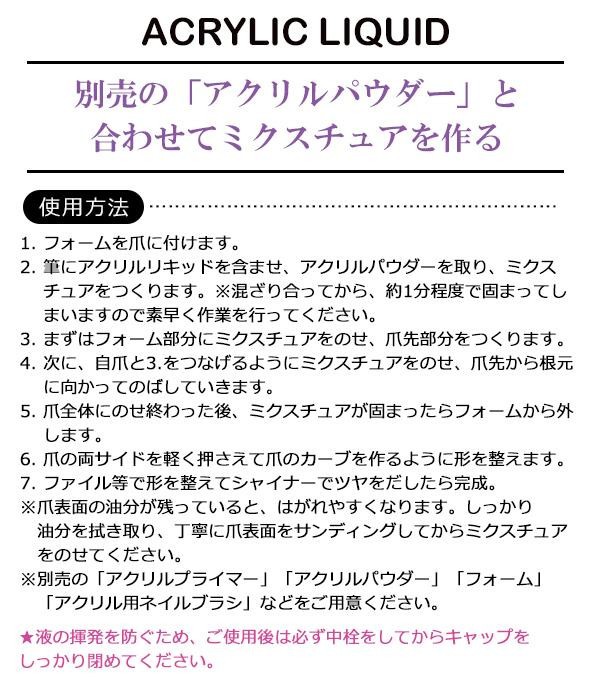 【ご注意】 ●爪以外や本来の目的以外でのご使用はおやめください。 ●爪に異常がある方、アレルギー体質の方、お肌の弱い方、お子様はご使用にならないでください。 ●開封時やご使用の際は目や口に入らないよう、充分ご注意ください。万が一、目や口に入った時や使用中に異常があらわれた時は、ご使用を中止し、直ちに専門医にご相談ください。 ●ご使用の際は、衣類などに液体がかからないよう注意し厚手の前掛けなどで衣服を覆ってください。周囲にペットや小さなお子様のいないことを確認してください。 ●容器にガラスを使用しています。落としたり、衝撃を与えますと容器が壊れる原因になりますのでご注意ください。 ●目やのどに刺激を感じたり、気分が悪くなった時は、すぐに新鮮な空気の場所に移動し、必要に応じて医師の診断を受けてください。 ●手や皮膚に付いた場合は、すぐに石けんと水で洗い流してください。 ●体質によりかぶれることがありますので、かぶれた場合はすぐに使うのをおやめください。かゆみや炎症が残った場合は医師の診断を受けてください。 ●ご使用後はしっかりキャップを閉めて、直射日光の当たらない平らな涼しい場所、お子様の手の届かない場所に立てて保管してください。 ●持ち運ぶと液体が漏れる恐れがありますのでおやめください。 ●強く引っ張ったり、無理な負担をかけないでください。破損する恐れがあります。 ●必ず換気の良い所でご使用ください。 ●高温多湿な場所、極端に低温な場所、火気に近づけたり、火気付近でのご使用、保管はおやめください。変形、変質の恐れがあります。 ●使用条件により変色、色落ちや品質劣化する場合があります。 ●7歳未満のお子様には絶対に与えないでください。 ●なめたり、口の中には絶対に入れないでください。 |