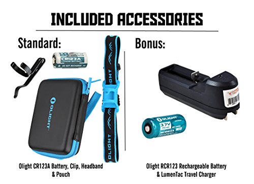 RECHARGEABLE PACKAGE - Includes the headband, clip, Olight CR123A battery and a quality pouch to keep everything together as well as an Olight RCR123A Rechargeable Battery and LumenTac travel charger kit so you're never without power!