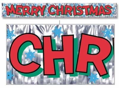 Studio : Beistle Publisher : Beistle Binding : Kitchen Product Description Let the Holiday Celebrations begin with Decorations! Start your Holiday Celebration off with a bang! Metallic Merry Christmas Banner Metallic fringed material Silver fringed banner with big red letters Contains: Metallic Merry Christmas Fringe Banner 8in.x 5ft., 1/pkg, Pkg/12 0