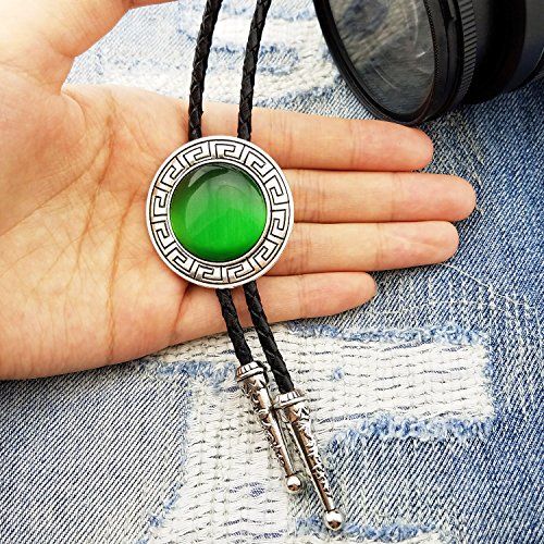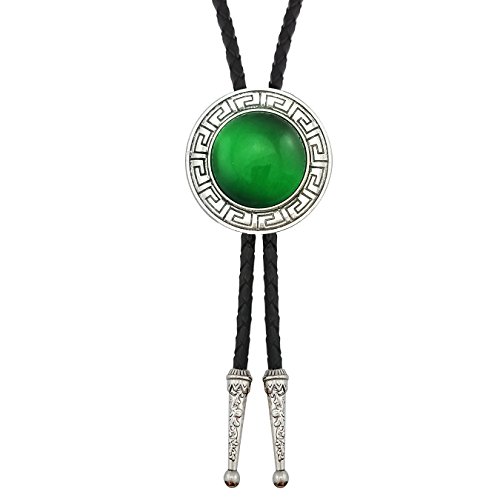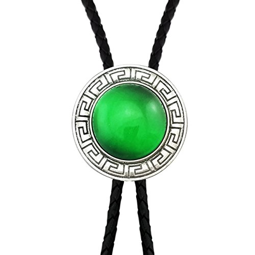 Lanxy Vintage Western Cowboy Celtic Pattern Round Green Emerald Color Stone Bolo Tie Silver Tone