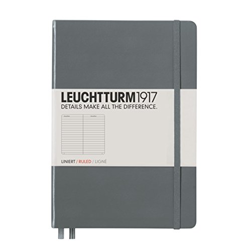 Designed in Germany this Anthracite Medium sized notebook by Leuchtturm 1917 measures 5.75 by 8.25 inches and contains 249 numbered pages of bleed-proof, acid free lined paper. Made with the highest quality materials and an easy to wash hard cover, each book is thread bound and opens flat for easy note taking. Additional features include a blank table of contents, stickers for labeling and archiving, 8 perforated, detachable sheets, expandable inner pocket and page marker.