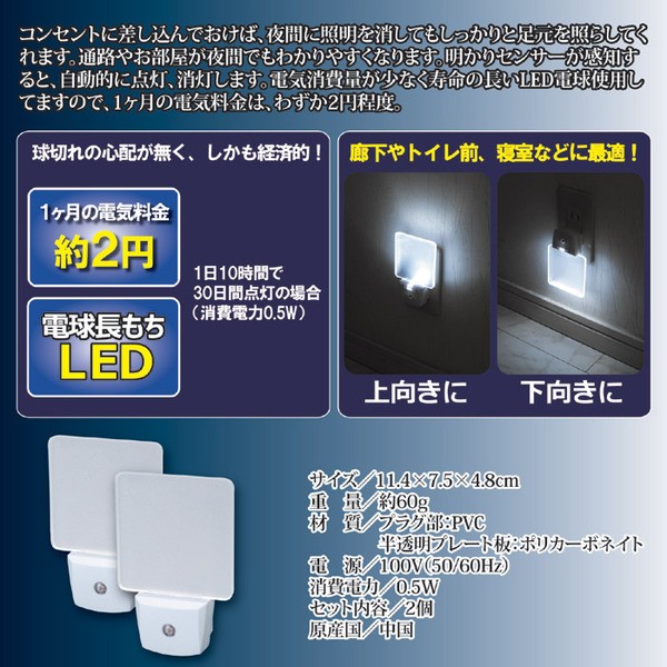 【商品名】自動で点灯!LEDナイトランプ 2個組