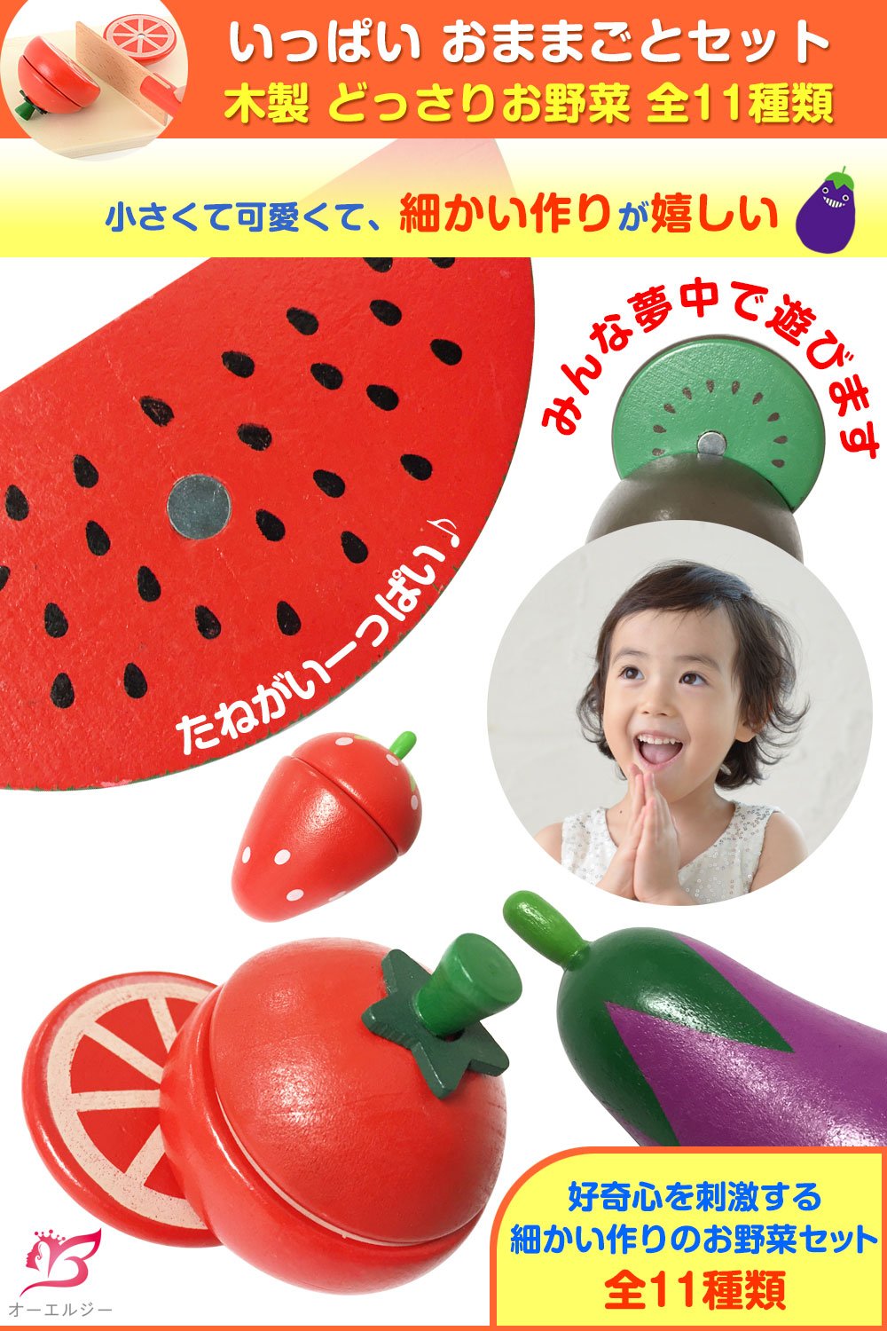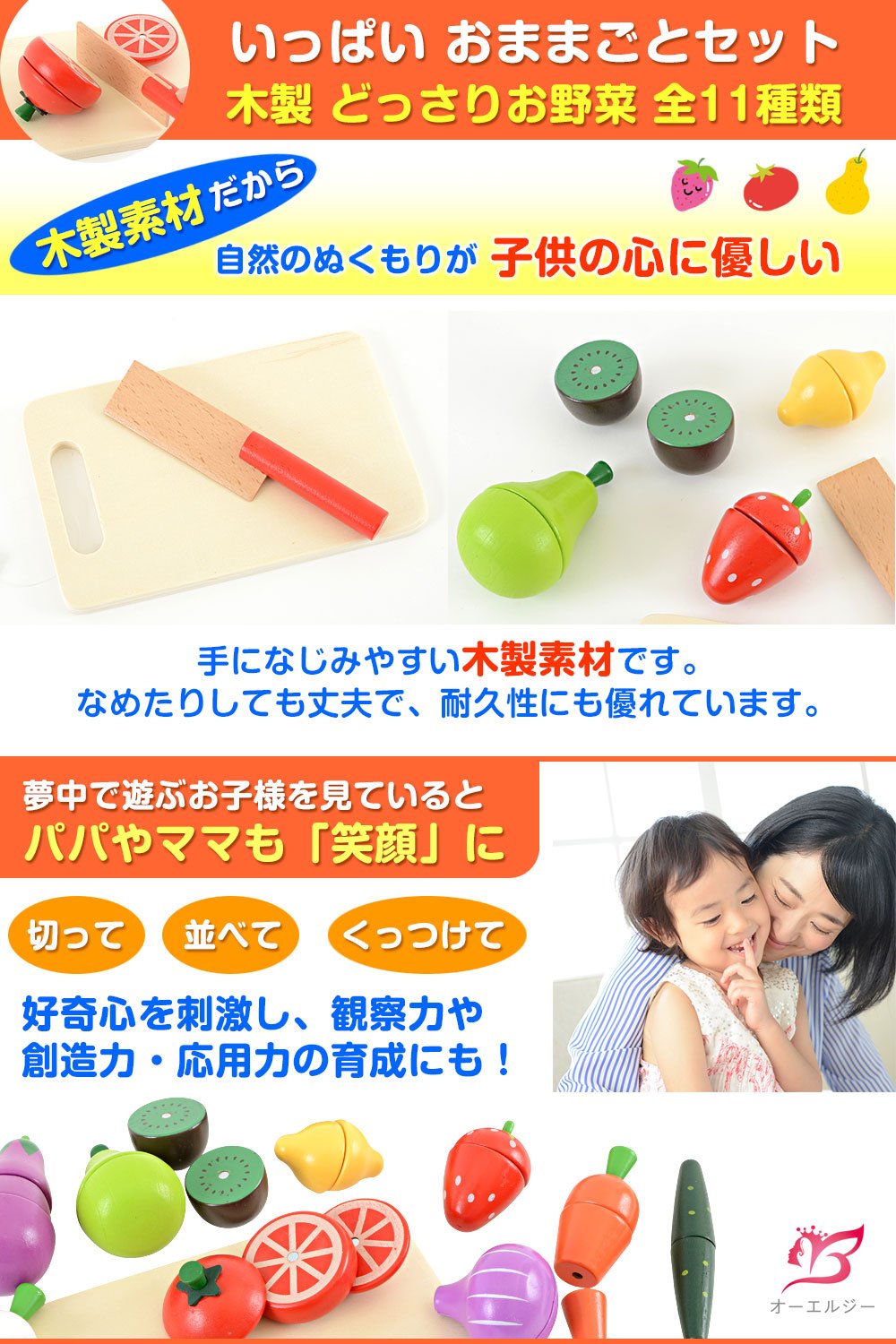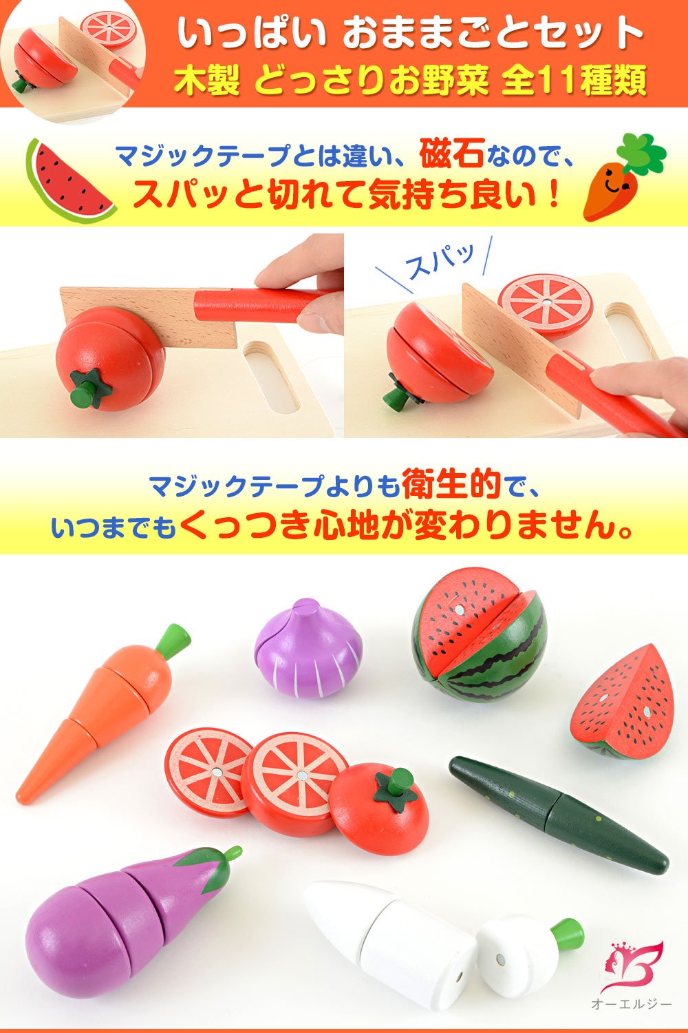 たっぷり遊べるお野菜全11点セットに、まな板も包丁もついています。自然のぬくもりが子供の心に優しい、木製素材。 マジックテープよりも丈夫で、少ない力でスパッと切れる磁石の設計。小さなお子様にぴったりです 切り心地が気持ち良い!子供たちが夢中になります! おしゃれな木箱入りで、ギフトやプレゼント、お祝いへの贈り物に最適です