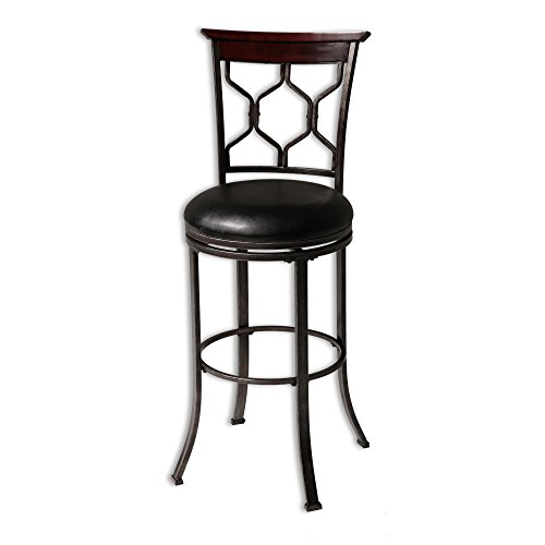 -. Feature : Circular swivel-seat has a rotating range of 360°; 30" seat height designed for 40" to 45" bar counters / Steel construction paired with Heritage Silver finished frame, Dark Cherry wood stain and Black faux leather upholstery / Simple lines and modern design will add a touch of chic sophisticated style / Measures 18" (L) x 18" (W) x 44.5" (H) with a 17" diameter seat and 12" footrest height / Comes with a 1-year limited warranty against manufacturing defects; Includes all hardware needed for easy assembly / Circular swivel-seat has a rotating range of 36°; 3" seat height designed for 4" to 45" bar counters / Eye-catching seatback design and Dark Cherry wooden top rail offers appealing option for extra seating / Straight legs flare-out at the base, footrest and swivel-seat complete the look of contemporary piece / Provides seating for kids doing homework at the counter, keeping the cook company, or gathering of friends / Warning: May cause loved ones to pause a minute, rest their heels and enjoy each other's company