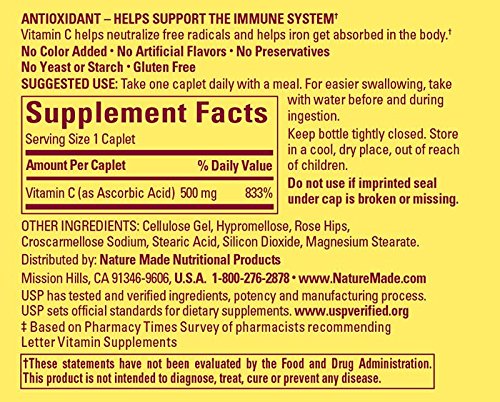 -. Binding : Health and Beauty -. Brand : Nature Made -. EAN : 0031604112592 -. Feature : Recommended as part of daily regimen for winter wellness and immunity / Aids in proper function of immune system / Offers antioxidant benefits for lungs and lens of the eye / 1 bottle, contains 130 tablets -. Label : Nature Made -. Manufacturer : Nature Made -. PackageQuantity : 1 -. ProductGroup : Pantry -. ProductTypeName : HEALTH_PERSONAL_CARE -. Publisher : Nature Made -. Studio : Nature Made -. Title : Nature Made Vitamin C with Rose Hips Tablet, 130 Count -. UPC : 031604112592