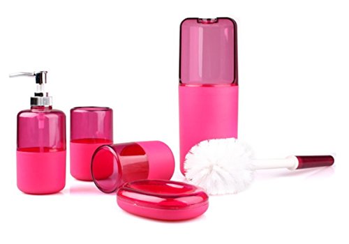 5-Piece Bathroom Accessory Set Dispenser Holder Tumbler Brush Soap - Stylish Plastic Fashion Red