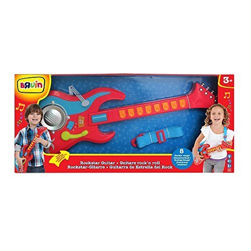 They'll have a rockin' good time with this colorful Bruin Rockstar Guitar! Rockstar Guitar is ready to jam! Play along with one of the 8 included songs, or use the guitar keys, strum button and whammy bar for a solo session. Volume control and an adjustable shoulder strap are also included. The bright colors and sounds from Bruin Infant and Bruin and Friends baby learning and activity toys are great for encouraging interaction. The simple shapes and designs of Bruin Infant toys give babies and children the things they want to play with in a safe and fun format.