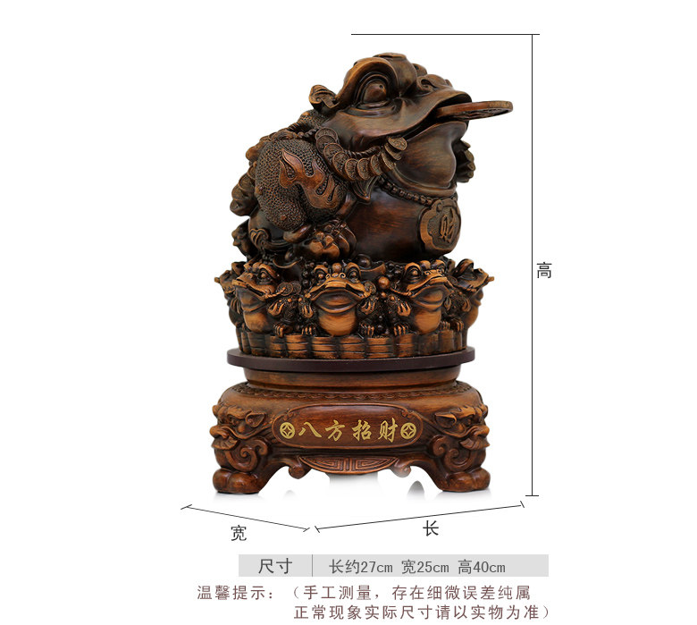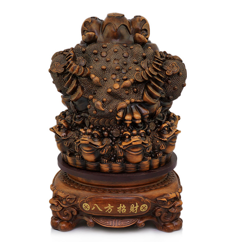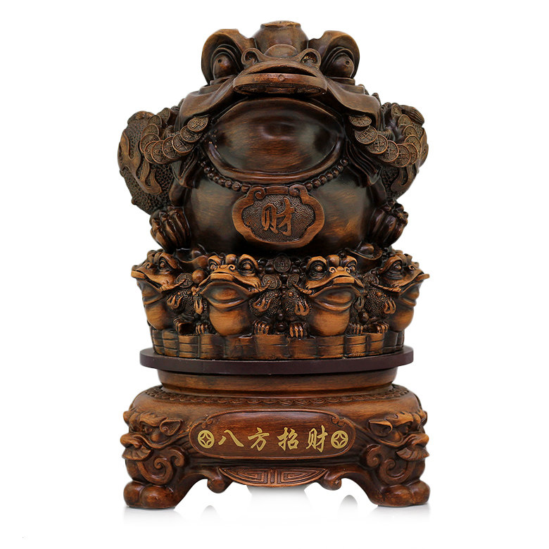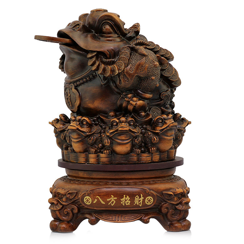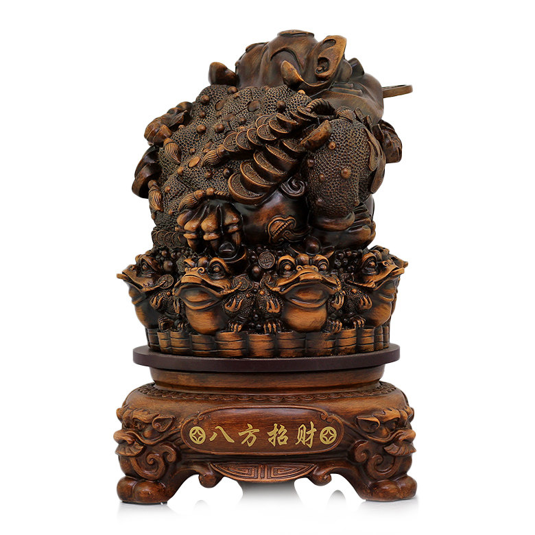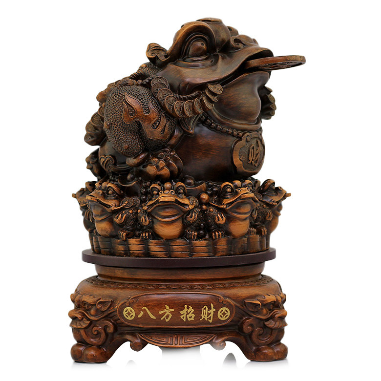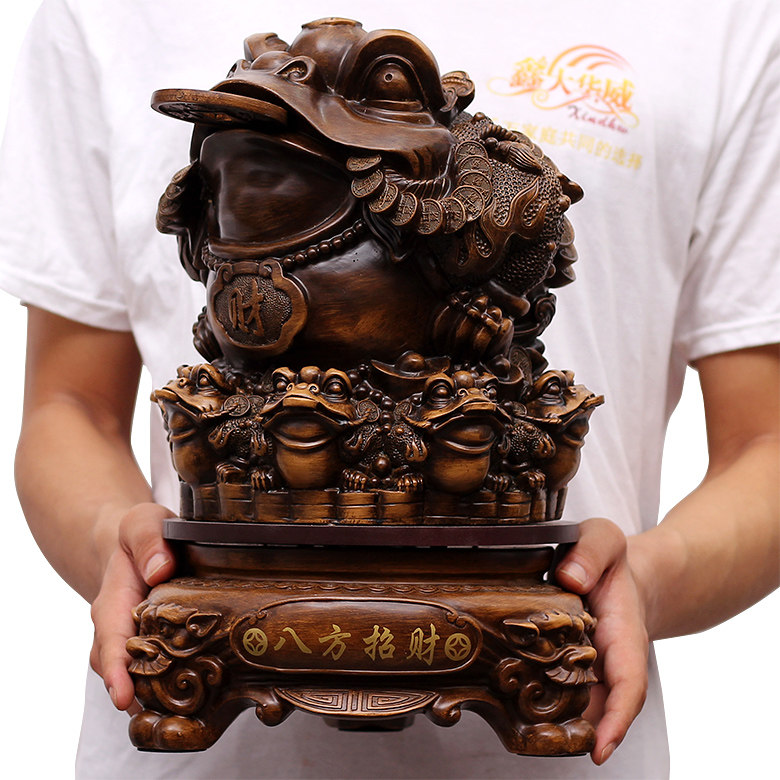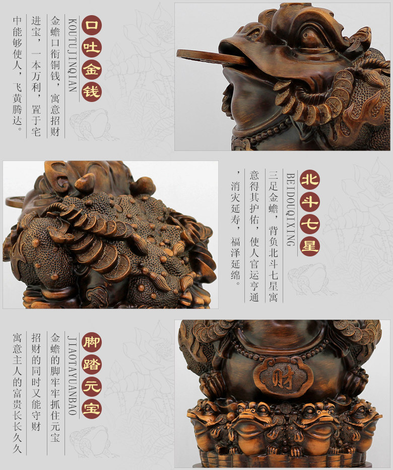 金蟾口吐金钱,是招财的吉祥物,三足,背上北斗七星,嘴衔金钱,背负铜钱。三脚金蟾所居之地,都是聚财之宝地,宅内摆放金蟾,有吸财、吐财、聚财、镇财的作用。