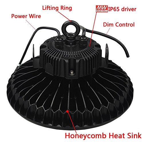 - Super Long Life: 100,000 hours lifespan. The LED high bay lighting come in 5000K light temperature. The 5000K color light ensure a clear bright light.120 Degree angle of light sends light downward in an efficient way. 100,000 hours save having to replace bulbs. Aluminum Housing with high tech heat sink protect the LED Driver. Better heat dissipation ensures longer led life and safely. Acrylic Lens. Mean Well IP65 driver waterproof