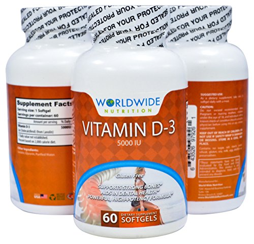 -. Feature : VITAMIN D-3 is the most superior form of Vitamin D. The D-3 compound ensures your body has access to calcium which increases bone, teeth, and cartilage health while simultaneously aiding muscle growth and functioning. / D-3 VS. D-2: Vitamin D-3 is the ULTIMATE NUTRIENT FOR HUMAN HEALTH. D-3 is far better absorbed and utilized in the body compared to Vitamin D-2 and helps maintain Vitamin D levels in your body in the long run, which D-2 does not do. / VITAMIN D DEFICIENCIES lead to increased risk of bone fractures, greater risk of developing osteoporosis, and leads to dangerously low levels of phosphate in the blood stream. / HIGH QUALITY SOFTGELS: Worldwide Nutrition's advanced softgel capsules allow for an easy-to-swallow method and promotes rapid release for optimal absorption and assimilation into the body. / FORMULATED BY INDUSTRY EXPERTS: Worldwide Nutrition's advanced capsules are made with minimal ingredients and the daily recommended dosage of 5000 IU-as stated by the Vitamin D Council- to maximize Vitamin D-3's natural benefits.