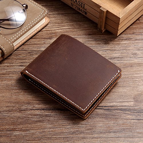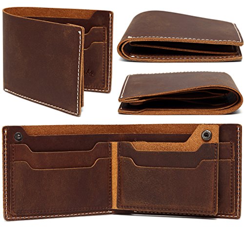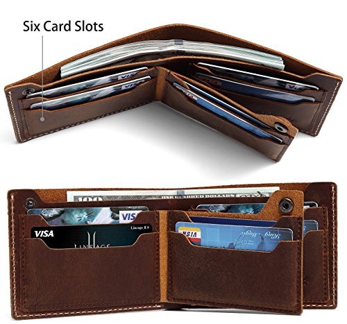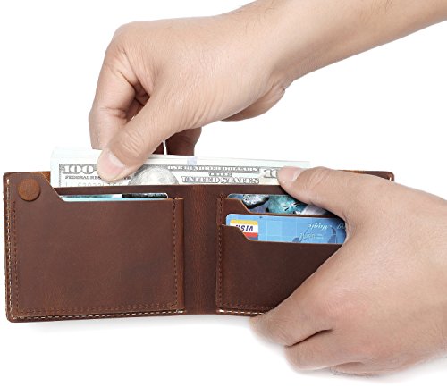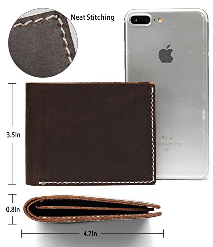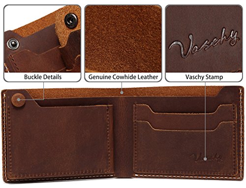 -. Feature : GENUINE LEATHER: The leather wallet is made from vintage cowhide tanned distressed cowhide leather sewn with cream poly thread with vintage look.The cowhide distressed leather is a gorgeous leather which is vintage and gets better with age. / FUNCTION DESIGN: With 6 card slots ,it's easy to carry all your important cards and money. One billfold with room for US, Canadian or UK sized currency.The leather button on the card slot is for slim look. / SIMPLE&CLASSIC: This Bi-fold wallet was designed based on simplicity but significant. So we made the slope card slot to show its uniqueness. This leather wallet is extremely convenient to be carried around in your front or back pocket.Dimension: W4.7xH3.5'' / PERFECT GIFT This traditional, thin, cool, minimalist leather wallet in light brown color is the must-have for everyday life. Leather wallet will fit in money and cards easily. The mens leather wallet is the best gift for Groomsmen, Birthdays, Anniversaries, Father's Day, Christmas and other Special Occasions. / WARRANTY: All of the Vaschy products are with One Year Warranty.The best vintage leather wallet that is guaranteed to last.