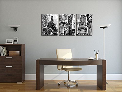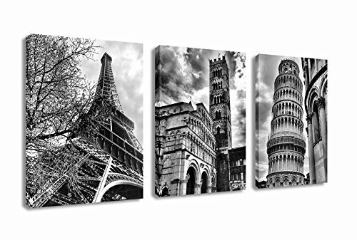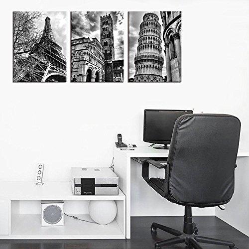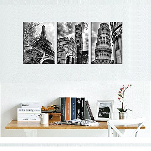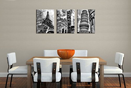 -. Title : Famous Architecture Canvas P.R.Ints Wall Art Decor Framed Ready to Hang - 3 Panel 12" x 16" Modern Building Giclee P.R.Ints on Canvas for Home Office Decoration - Eiffel Tower Leaning Tower of Pisa Italy