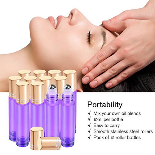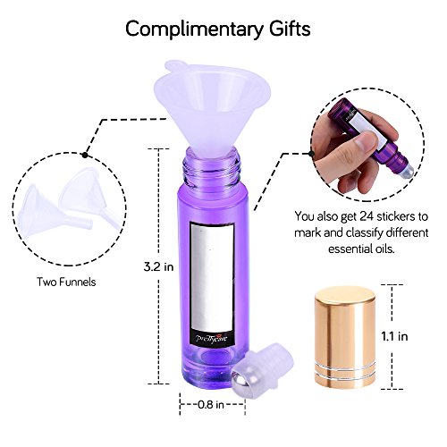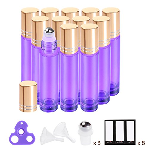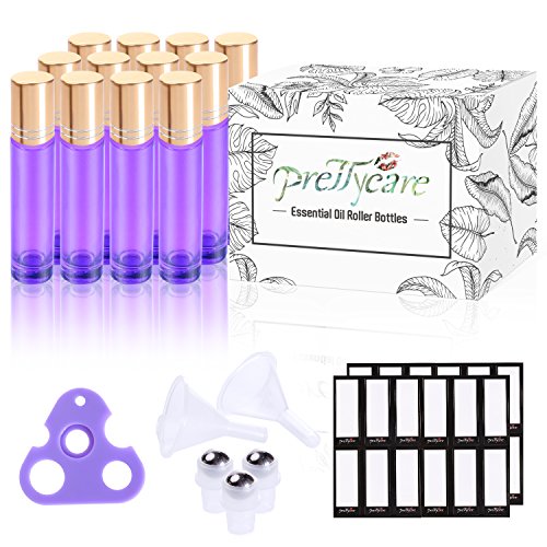 Roller Bottles 10ml ( Popular Ultra Violet Glass, 12pack, 3 Extra Stainless Steel Roller Balls, 24 Labels, Opener, 2 Funnels by PrettyCare ) Purple Roll on Bottles,...