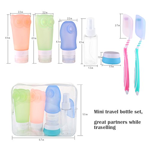 - Owl Silicone Travel Bottles Set:2.8 oz (83ml) owl squeeze tubes x 2, 2oz(60ml)squeeze tubes,2/3oz(20ml)cream jar,5/3oz(50ml)spray bottle,toothbrush cover x 2. Perfect for Soap, Shampoo, Lotion, Face Wash and Other Liquid Toiletries