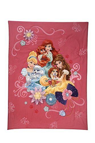 The Disney princesses and their pets make the Disney palace pets 4 piece toddler bedding set twice as fun for your little girl. The favorite Disney princesses Cinderella, belle aurora and Ariel are joined by their sweet little friends, the palace pets. Made from extra soft microfiber fabrics, the convenient 4 piece set includes a printed comforter, flat top sheet, fitted bottom sheet, and a reversible printed pillowcase. Designed to fit a standard toddler size bed, with a 28 x 52" mattress.Feature