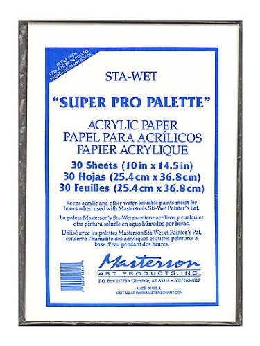 The Sta-Wet Pro Palette refill acrylic paper keeps acrylic and other water soluble paints moist for hours, days, even weeks when used with Masterson's Sta-Wet Pro Palette. 30 refill sheets. 10 x 14-1/2.Feature