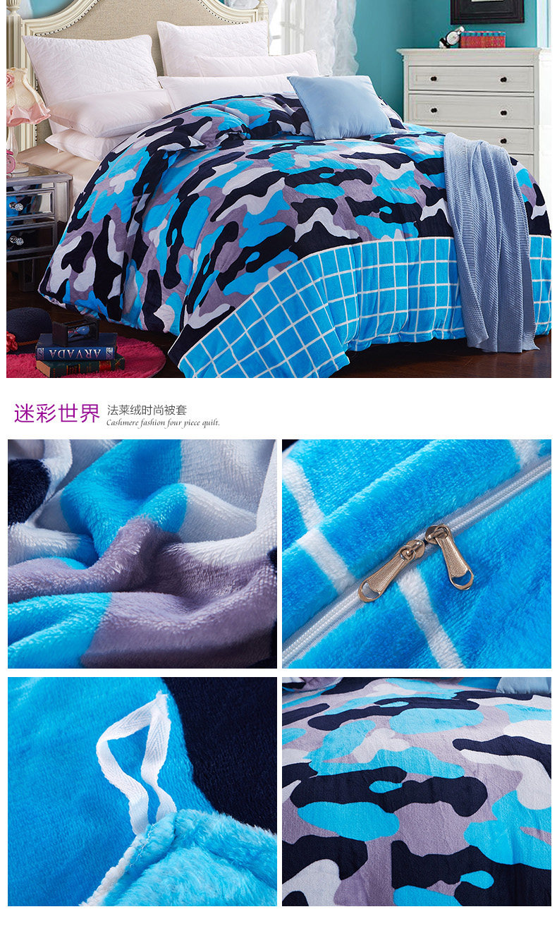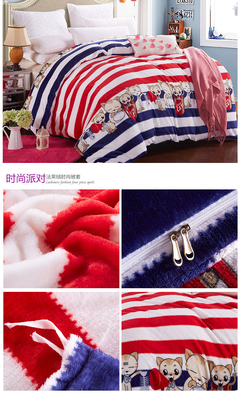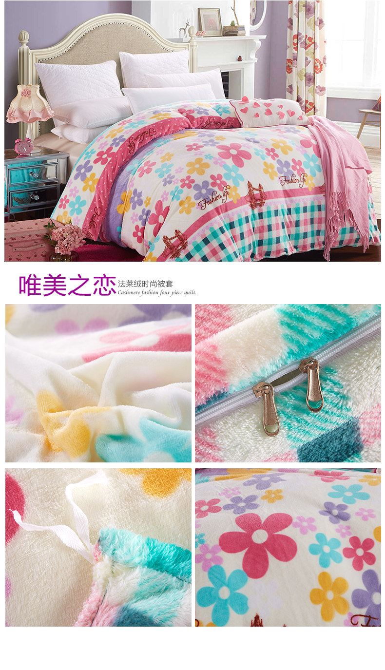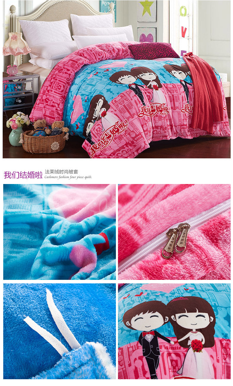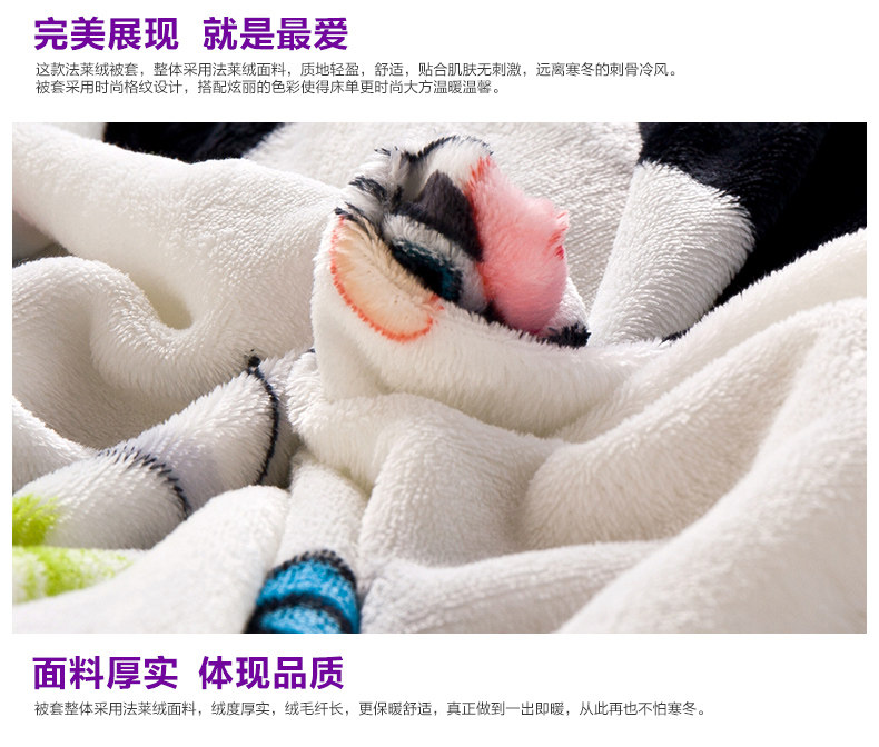 Product Name: flannels quilt coverProduct Fabric: 100% polyester fiberProduct lining: 100% polyester fiberProduct Grade: QualifiedStyle: Modern FashionFabric technology: active dyeingSpecifications: 1.5 * 2 m, 1.8 * 2 m, 2 * 2.3 m, 2.2 * 2.4 m