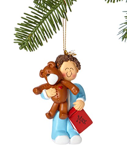 Brunette Boy with Teddy Hand Personalized Christmas Ornament