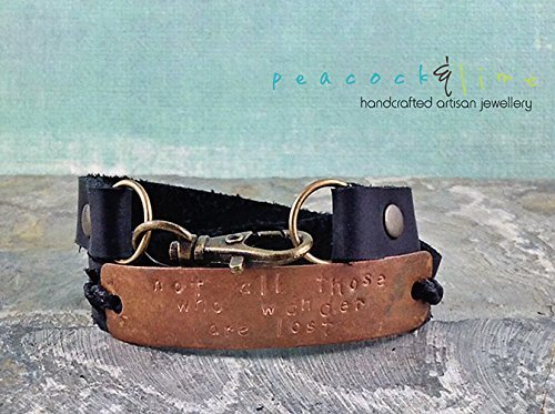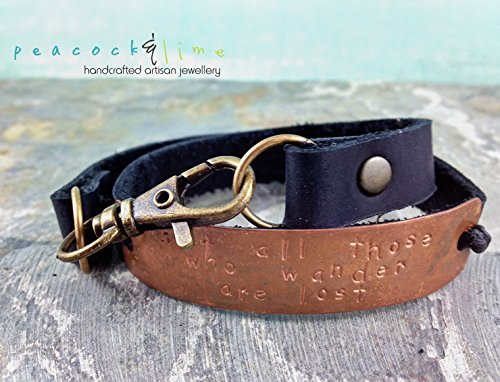 -. Title : Not All Those Who Wander Are Lost // black leather & copper hand stamped quote multi wrap bracelet