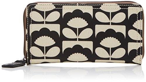 Matt laminated wallet in the 'tiny spring bloom' print with navy linear stem jacquard lining and contrast coloured zip to close. Inside details include a zipped compartment for change and card/note slots.
