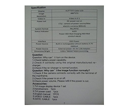 -. Feature : Video test automatically identification with access HD-TVI Video signal / Automatic identification NTSC/PAL Format image signal / High capacity li-polymer battery, charge time 4 hours, and work time 11 hours / 2600mAh li-polymer battery, DC12 1A power output / Provide camera power temporary. Network Cable tester
