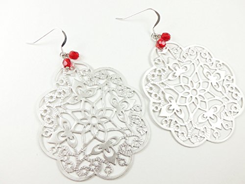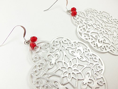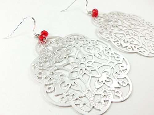 -. Title : Red Earrings Sterling Silver Filigree Boho Chic Large Statement Jewelry Metal