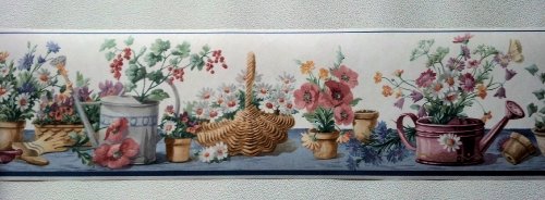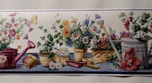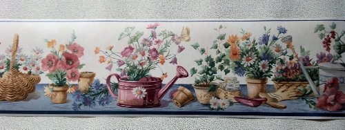 Gardening Flowers Watering Can Wallpaper Border – Blue…