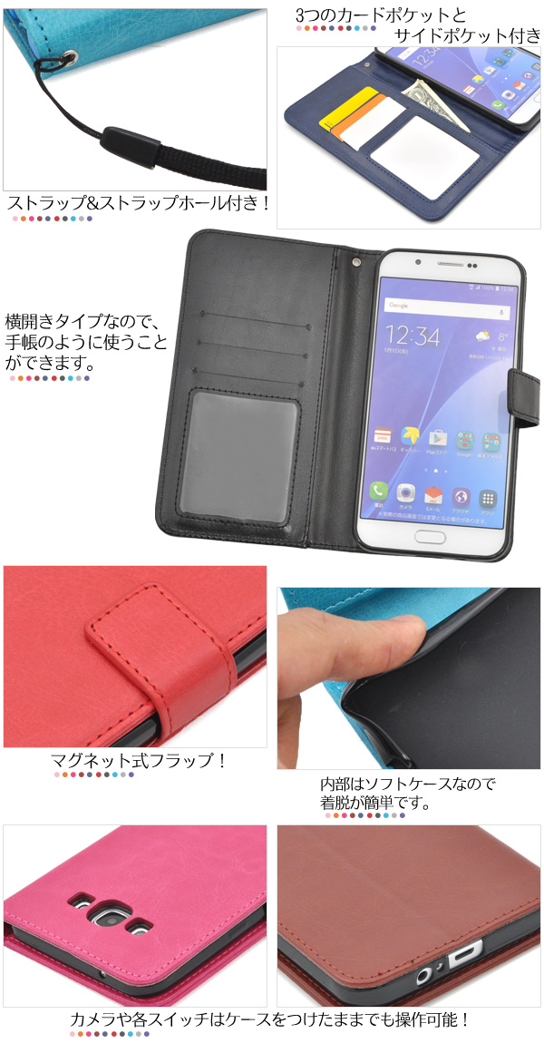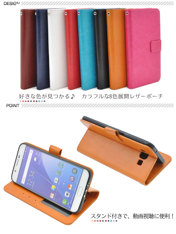Galaxy A8 SCV32用カラフルな8色展開のカラーレザースタンドケースポーチ