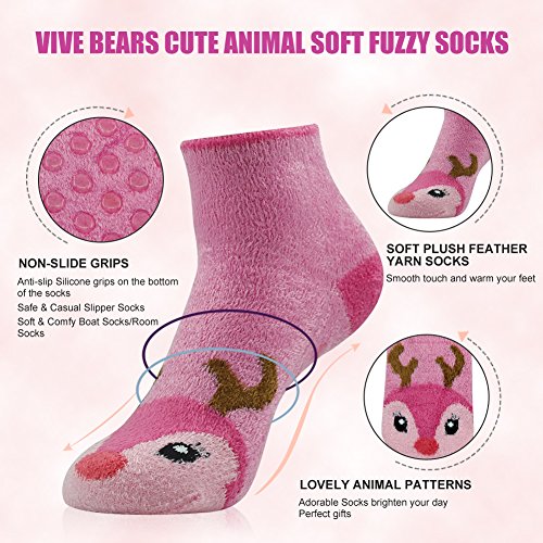 -. Feature : Silky & Fluffy - Vive Bears plush socks are made from High quality feather yarn, super soft and smooth, let your feet enjoy the feeling of stamping on the clouds; women's feather socks are not too thick and heavy and provide maximum comfort for your feet and keep them warm all the time; these fuzzy socks are not itchy at all and not easy to shed fluffs / SKID Resistant - Gripping rubber dots on the bottom keep you safe while walking on the slithery floor, help keep your loved ones safe by reducing the risk of falls & injuries and meanwhile won't scuff your floors; The grip socks can also help you stay steady and perfect for indoor workout / Lovely & Sweet Gift - Vivid cartoon and festive designs with vibrant colors, really stylish and adorable! Cute cat, bear, deer pattern and you can always find your favorite. These winter slipper socks are just the right thickness for comfort and warmth.Perfect birthday present for your family and friends! / Size - Suitable for Women's shoe size 4-10, luxurious feather yarn make the sock perfectly wraps your feet, providing maximum comfort and protection, just what's needed when one kicks off the work shoes; The elastic bands at the ankle do not compress you.Why not share these soft slipper socks with friends or family on New Year,Valentine's Day or other holidays / Versatile - Our fuzzy winter socks can Easily match your favorite outfits, slippers, boots, loafers or sneakers; wearing these pillow fuzzy socks is important to your health, it will strengthen your blood circulation and health; wearing them when you go to bed, they will keep your feet warm all night which means great to your health. To someone who has chilly feet, our fluffy socks will be a great gift! Just click the "Add to Cart" button and bring them home now!