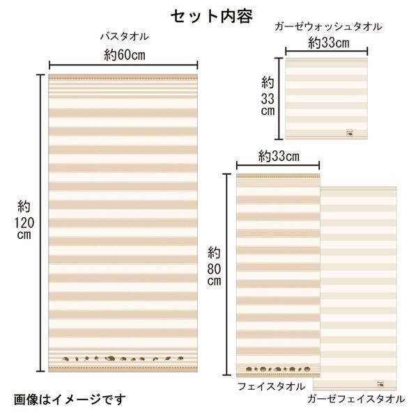 | サイズ | バスタオル:約60×120cm、ガーゼフェイスタオル:約33×80cm、フェイスタオル:約33×80cm、ガーゼウォッシュタオル:約33×33cm 個装サイズ:27.7×40.7×5cm |
