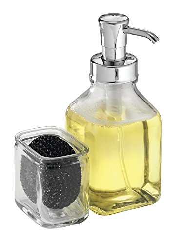 mDesign Glass Soap Dispenser Pump and Sponge or Scrubber Caddy Organizer for Kitchen - Clear/Chrome