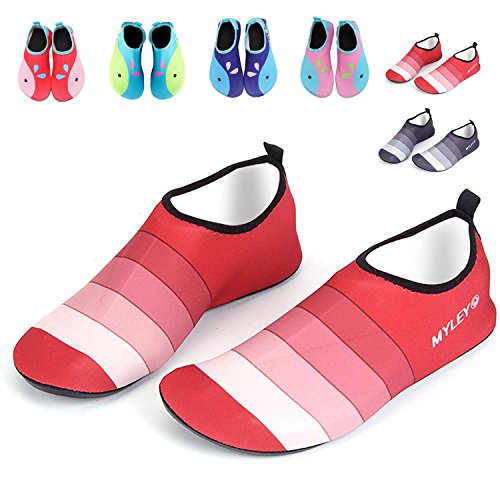 -. Feature : RUBBER OUTSOLE & FOOT SAFETY - Anti-Slip soft honeycomb rubber sole,achieve the same benefits as walking barefoot Aqua Socks,protect feet from injury well.Also,the highly adhesive material to prevent slipping while doing exercise and sports activities / Lightweight - 92% Polyester+8% Spandex Upper,Only 80-180g per pair,as super light skin aqua socks make kids feel walking just as flying / COMFORTABLE & FIT - Breathable and smooth fabrics with fine stretch on uppers,soft,like socks,flexible and comfortable,help feet relieve fatigue well / Multifunctional - Unisex Water Shoes perfect for running,swimming,surfing,volleyball,weight training,walking,fishing,gardening,yoga,sports / Slip-on Water Aqua Socks Shoes - Smooth neck design prevents scratching when wearing,easy to wear and take off,refund and replacment are guaranteed