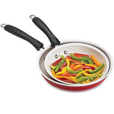 Every cook's favorite, these skillets can be used to brown, sear, braise a variety of foods and even cook bacon and eggs for breakfast. Nonstick interior cleans up easily. Cook up tasty meals for your friends and family with this 2-piece set, which includes 8" and 10" skillets that are made from aluminum with ceramic interiors for lasting use. The classic red exterior will add a splash of color in any kitchen. 2 Pack Color: Red Consisting of one 8" and 10" skillet Aluminum construction Ceramic coated interior Riveted design Nonstick surfaces make cleanup simple PTFE/PFOA free and petroleum-free Can be used to brown, sear, braise a variety of foods and even cook bacon and eggs for breakfast.Feature