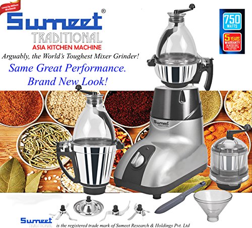 Sumeet has always stood for Versatility, Reliability and Durability. Sumeet celebrates 50 years of people’s trust who have continuously revered Sumeet products for their quality and performance. New Sumeet Asia Kitchen Machine is the world’s toughest mixer grinder with 750 watts grinding speeds and 22,000 rpm is the most efficient mixer grinder that grinds spices, make chutneys, idli paste, smoothies, juices, milkshakes within a fraction of time. Sumeet Asia comes with an exclusive recipe book where you can explore a lot more of recipes you can prepare with Sumeet Asia Kitchen Machine.The ASIA GRINDER Jar has a "Double Wall Stainless Steel" construction, a redesigned integrated blade and lids with a more user friendly snap-in locking system. Configuration: • 1 Basic unit • 1.5 ltr stainless steel jar with polycarbonate dome • 1.25 ltr stainless steel jar with poly carbonate cover • Small quantity grinder jar with pre fixed blade • Spatula and blade remover Sumeet Asia Machine is the most powerful mixer grinder that whips, minces, chops, blends, grinds, beats, does wet grinding, dry grinding, makes chutneys, smoothies and more. Features: • Power Consuption : 750 watts • Revolutions : 22000 RPM • Jars : 3 • Type: Grinder Set Blades: • 4 - square - dry grinding • 4 - triangle - wet • 2 - grater mincer Whipper: • Big - Liquid • Med - Dry Grinding • Small - Wet chutney The New Small Quantity Spice Grinder Jar, with its own built-in Stirrer is ideal for dry and wet grinding of up to 1/2 cup, be it fresh coffee powder, a quick chutney or fresh Nut butters in less than 90 Seconds. To tackle these demanding tasks with even better results, effective immediately Sumeet has increased the power of the motor from 550 Watts to 750 Watts. For 2015, we have given the Asia Kitchen Machine a New Look. It is Safety Interlocked with overload protection.Feature