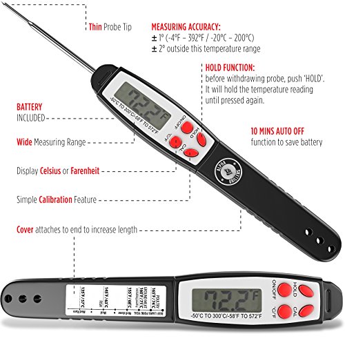 - NO MORE SPOILT MEALS - COOK WITH CONFIDENCE. Never again worry about ruining a steak by over or under cooking. With our digital meat thermometer at your disposal you can confidently cook any food to perfection. Get inspired to cook and BBQ more often, be creative in the kitchen and eat healthier! We even include a detailed laminated meat temperature guide for quick reference.