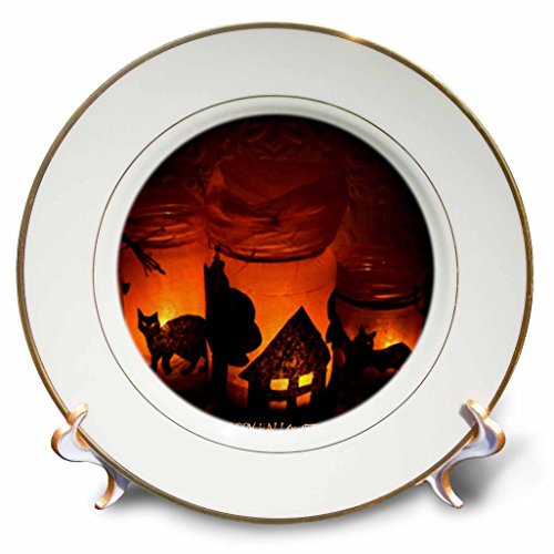 3dRose cp_6025_1 Halloween Cat, House and Bat Luminaries Porcelain Plate, 8-Inch