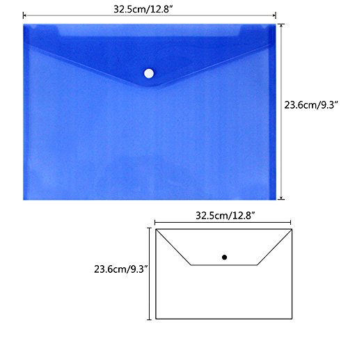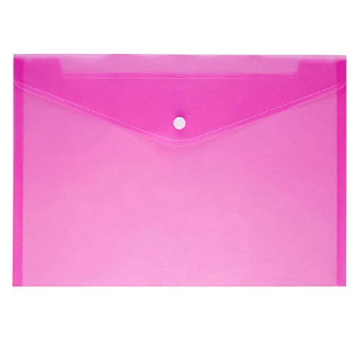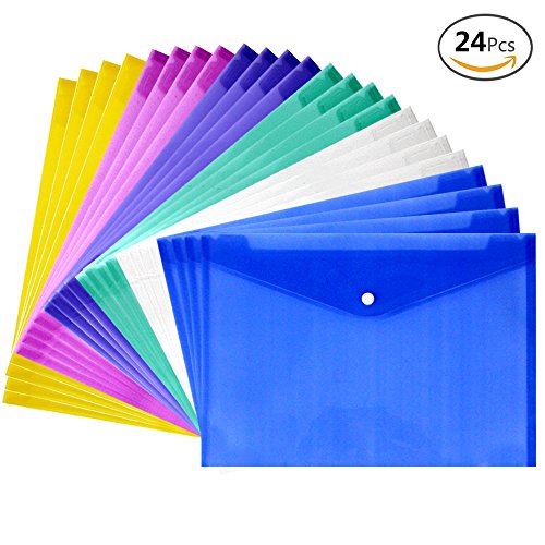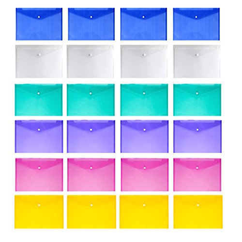 JUSLIN 24 pcs Waterproof Transparent Poly Envelope with Snap Button Closure,Project Envelope Folder, A4 Letter Size,6 assorted Colors,blue, transparent, green, purple, pink, yellow