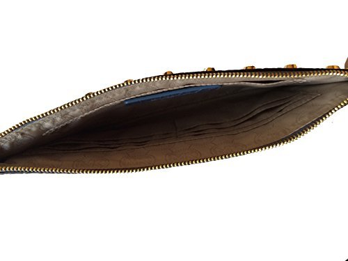 Wrapped in distressed denim blue canvas fabric and trimmed in denim blue embossed leather with golden studs and hardware. This large clutch has stitch detailing on the back and front, and Michael Kors' logo on the front as well. The lined interior features an open slip pocket as well as (6) card slots. The wrist strap as a drop of about 8 inches. Overall measurements are 9.75 inches (L) x 5.5 inches H) x 1.5 inches (W).Feature