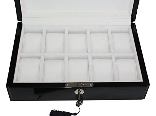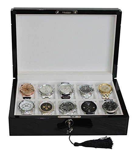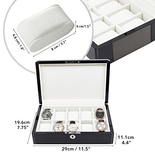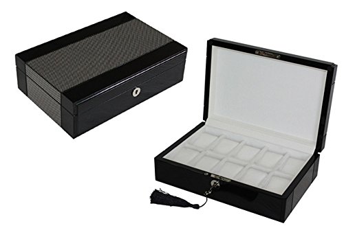 -. Feature : Tastefully protects, stores, and organizes up to 10 watches; Keep watches protected and scratch-free / Stunning piano black, high gloss finish with carbon fiber detail; Case measures approximately 8" L x 11.62" W x 3.375" H / Each compartment measures 45 mm in width (3" L x 1.75" W); Removable, plush pillows make room for other accessories / Deluxe cleansing cloth included with purchase; Handsome accessory for your nightstand, desk, or dresser / Secure your collection with our elegant lock and tassel key