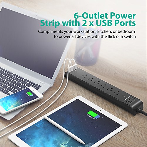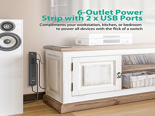 6-Outlet Power Strip with 2 x USB Ports: Compliments your workstation, kitchen, or bedroom with a total of 8 outputs to power all devices with the flick of a switch