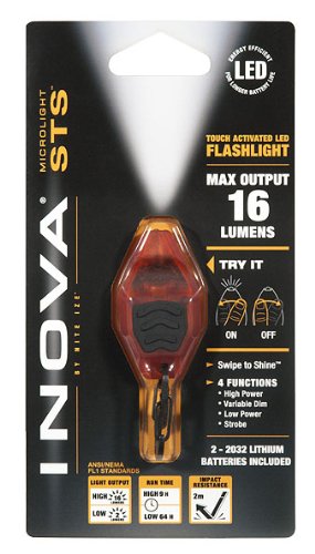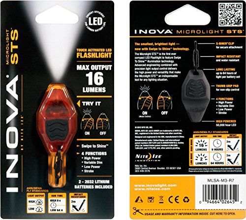 Studio : Nite Ize, Inc. Publisher : Nite Ize, Inc. Binding : Tools Home Improvement Product Description Featuring innovative "Swipe To Shine" touch technology, the INOVA Micro light STS is compact, convenient, and impressively powerful. Its durable, water-and-shock-resistant casing is designed to fit comfortably in your hand. It's our brightest INOVA Micro light, with an impressive 16 lumens. The white LED is activated nearly instantly with a quick right-to-left swipe of the thumb, eliminating the need to fumble with a switch. High, variable dimming, low, and flash modes allow you to use the light for everything from reading maps to finding keyholes to sending alert signals. The included versatile S-Biner Stainless Steel Double Gated Carabiner can be clipped to key chains, belt loops, zipper pulls, purse or backpack straps to keep your Micro light STS conveniently where you need it, when you need it. Powered by 2 replaceable 2032 lithium batteries (included). 0