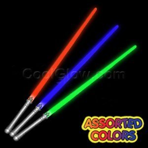 -. Feature : Each pack comes with 6 28" long super bright light sabers / Contains 2 red, green, and blue light sabers / On/Off LED feature creates a realistic light-up experience / Great for birthdays, Halloween, parties, and much more / 2 AA batteries are included and installed