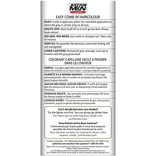 For guys who want a foolproof way to get rid of gray hair color for natural looking results, there's Just For Men AutoStop. This easy comb-in, no mix, no mess formula only takes ten minutes to color every single gray hair, and lasts until the gray hair grows back. Just For Men AutoStop comes in many natural looking shades, so it's easy to find the one that truly matches your natural hair color. Can't decide between two shades? Try the lighter one first. You can always go darker later. Made in the USA.