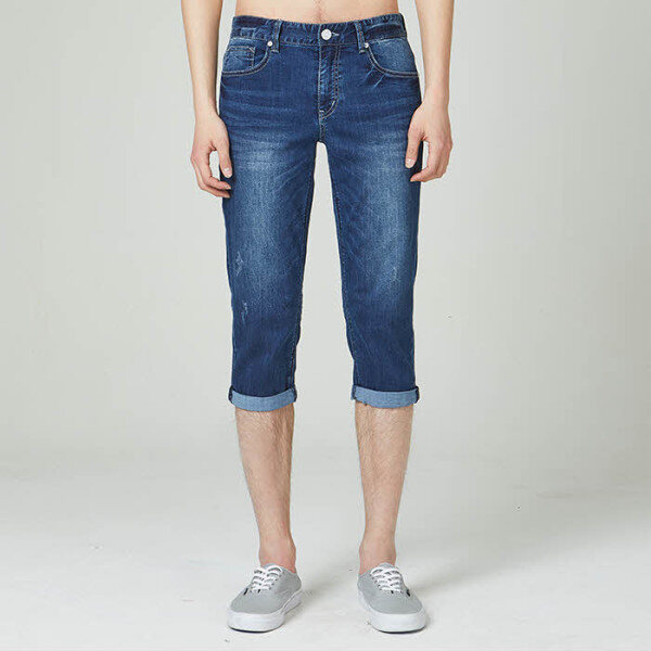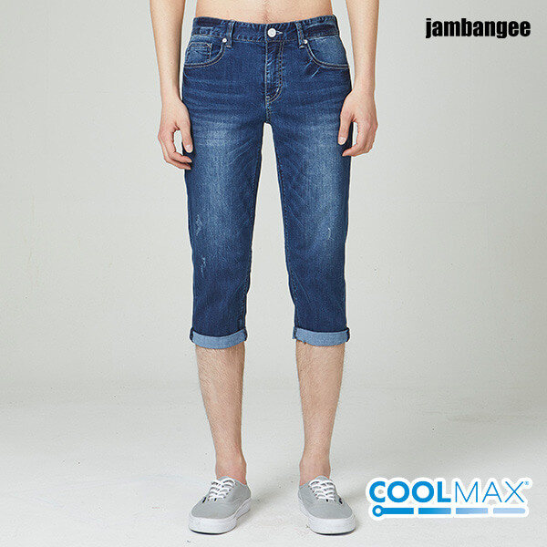 흡습성이 뛰어나 땀을 빨리 배출시켜 시원함을 느낄 수 있는 쿨맥스 소재로 세줄스티치 포인트에 MB톤 캣엠보 시와 워싱의 남성용 7부 롤업 데님스타일.