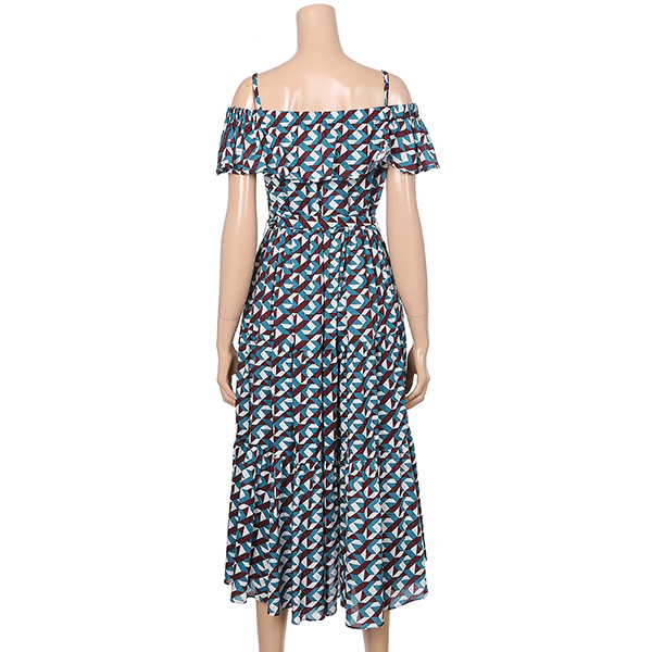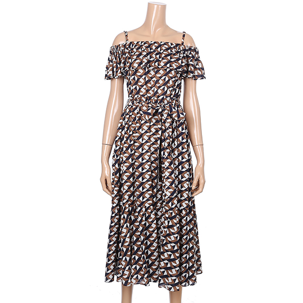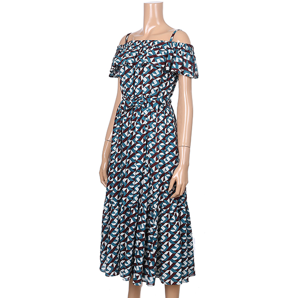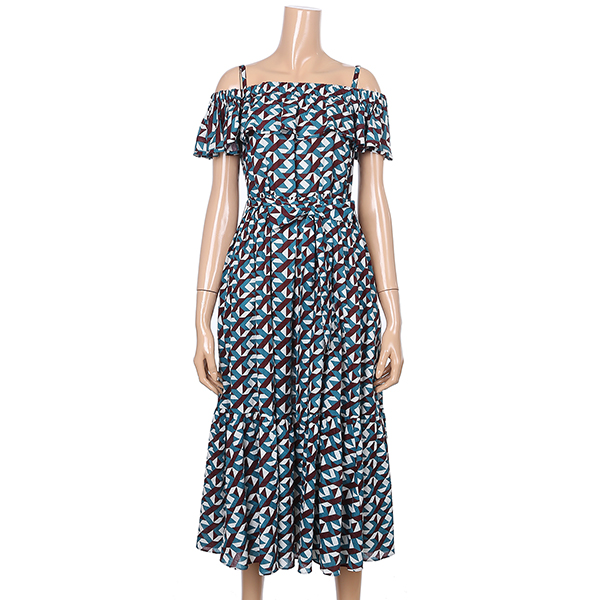 유니크한 패턴감의 오프숄더 원피스입니다. 허리에 리본 스트랩으로 슬림하게 연출하실수 있으며