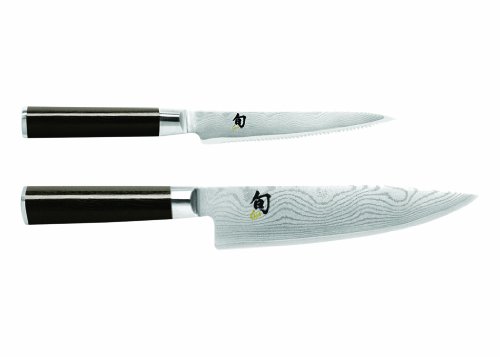 This Store Exclusive 2-Piece knife set features our Classic 8-inch chef's knife perfect for slicing, dicing and mincing vegetables or working with meat and poultry. The set includes our 6-inch serrated utility knife which is great for sawing through crusty loaves of french bread or difficult cuts of meat. Our Classic line of knives have blades that feature razor-sharp 16 degree cutting angle on each side and is made of layered Damascus cladding and VG-10 "super steel" cutting core. The ebony Pakkawood handle has that sleek, sophisticated look that makes these knives feel more like art, than instrument, while providing a comfortable grip that it moisture resistant. Crafted in Seki City Japan, our Shun Classics are forged in the tradition of samurai sword making. These heirloom quality knives will be a prized treasure you'll want to pass down to family for generations.
