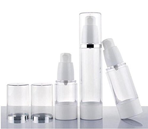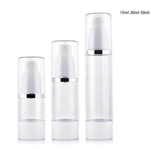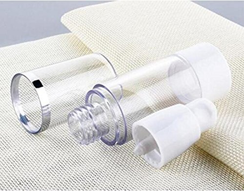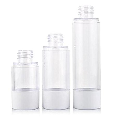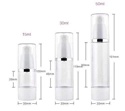 Package include:2pcs 30ML Airless Pump Bottle ; Color:clear&white; Material : AS Plastic; Capacity:30ml 1oz ; Size: 15ml Size: 100 mm x 33 mm (3.9 x 1.3 in.) 30ml Size: 119 mm x 33mm (4.7 x 1.3 in.) 50ml Size: 151 mm x 33 mm (5.9 x 1.3 in.)