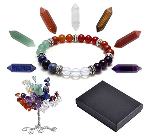 QGEM Christmas Gift! 7 Chakra Gems Tree of Life Set,Money Tree + 7 Chakra Column Hexagonal Crystals + Chakra Brarcelet Reiki Healing Feng Shui Spiritual Decor Ornaments